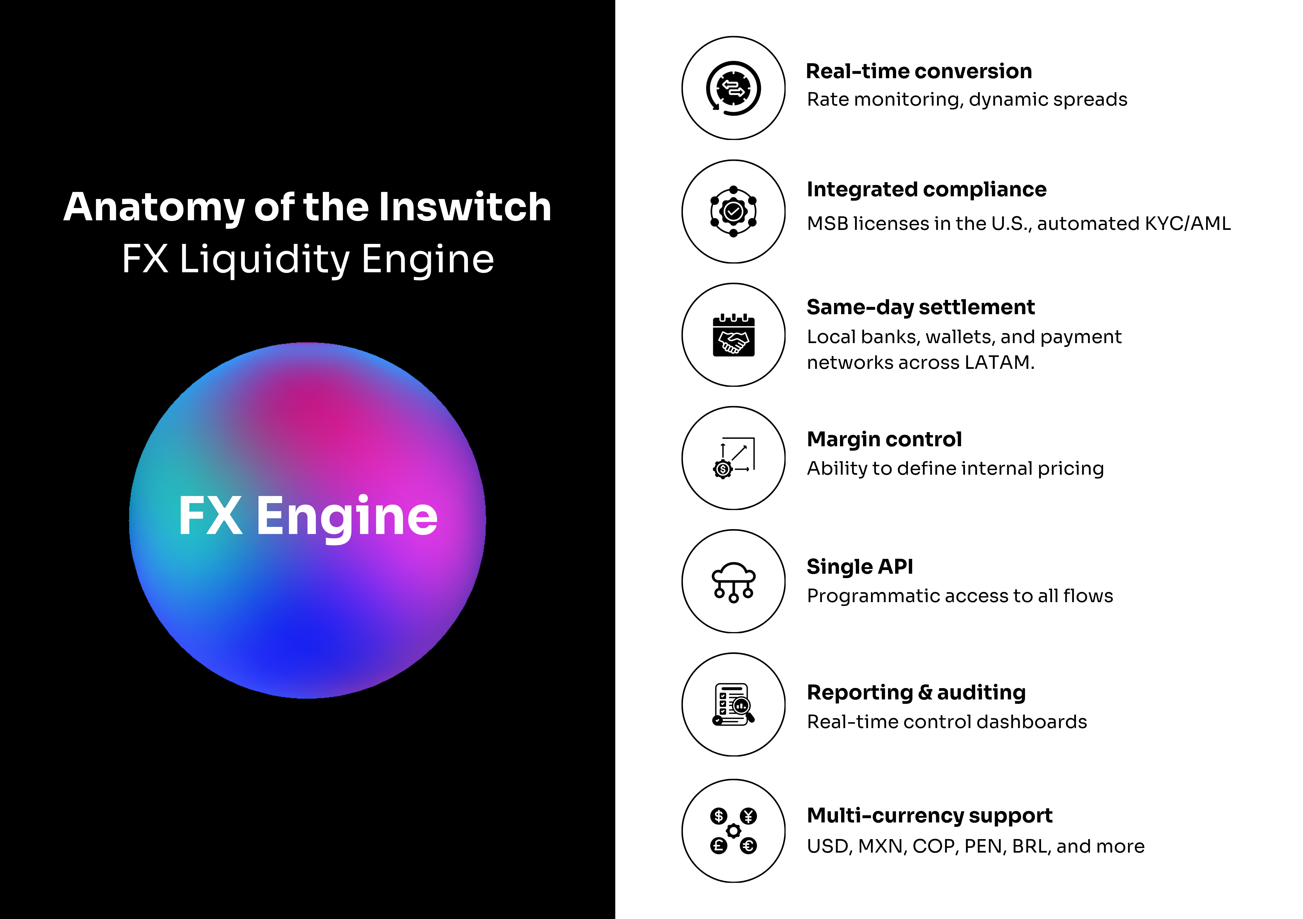 This is where Inswitch makes a real difference. Its FX liquidity engine currently processes over 30 billion dollars in annual flows for more than 70 MTOs (money transfer operators), offering same-day settlements in multiple Latin American markets. And most importantly: all from a single API.