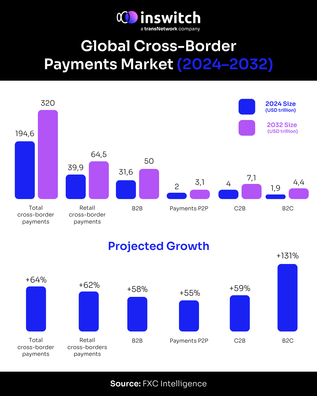 The global cross-border payments market moved approximately USD 194.6 trillion in 2024 and could reach USD 320 trillion by 2032, according to financial data firm FXC Intelligence. “Market growth will be driven largely by digital innovation, regulatory evolution, and rising consumer expectations,” the company explains.
